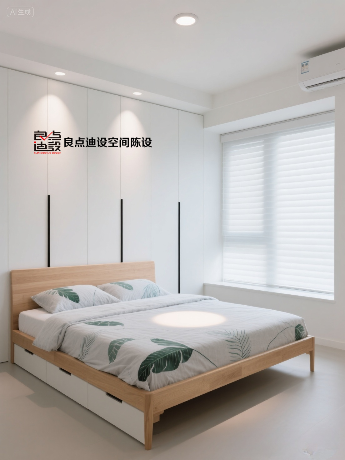 次臥空間不算大,整體采用定制設(shè)計(jì),以提高整體空間利用率,依舊是原木+白的配色方案,自然舒適和諧。床頭燈采用向上設(shè)計(jì),避免起夜開(kāi)燈刺眼,