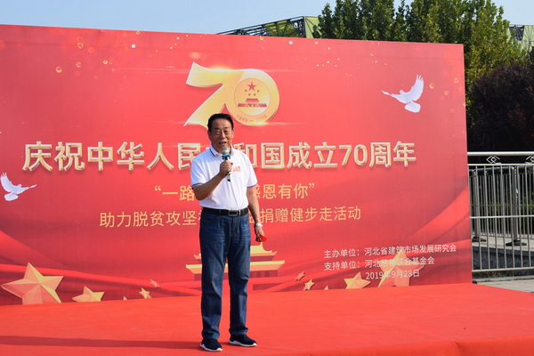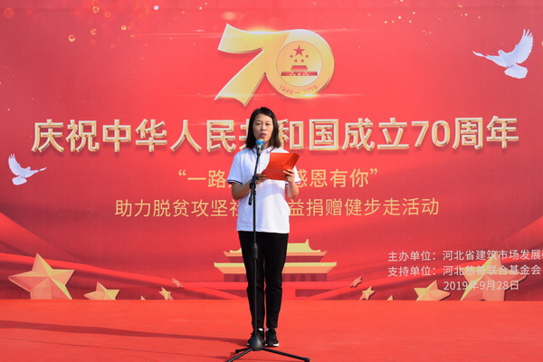 穆彩霞同志代表河北省建筑市場發(fā)展研究會向參與此次脫貧攻堅(jiān)捐贈(zèng)活動(dòng)的愛心企業(yè)和愛心人士表示衷心地感謝。與此同時(shí)她介紹 “一路走來,感恩有你”助力脫貧攻堅(jiān)社會公益捐贈(zèng)及健步走活動(dòng)基本情況,強(qiáng)調(diào)指出此次活動(dòng)是配合河北省住房和城鄉(xiāng)建設(shè)廳,聯(lián)合河北慈善聯(lián)合基金會共同開展慶祝中華人民共和國成立70周年,“一路走來,感恩有你 ”助力脫貧攻堅(jiān)社會公益捐贈(zèng)及健步走活動(dòng)。本次活動(dòng)旨在聯(lián)合社會各界愛心人士共同解決保定市阜平縣史家寨村村民的飲水問題。