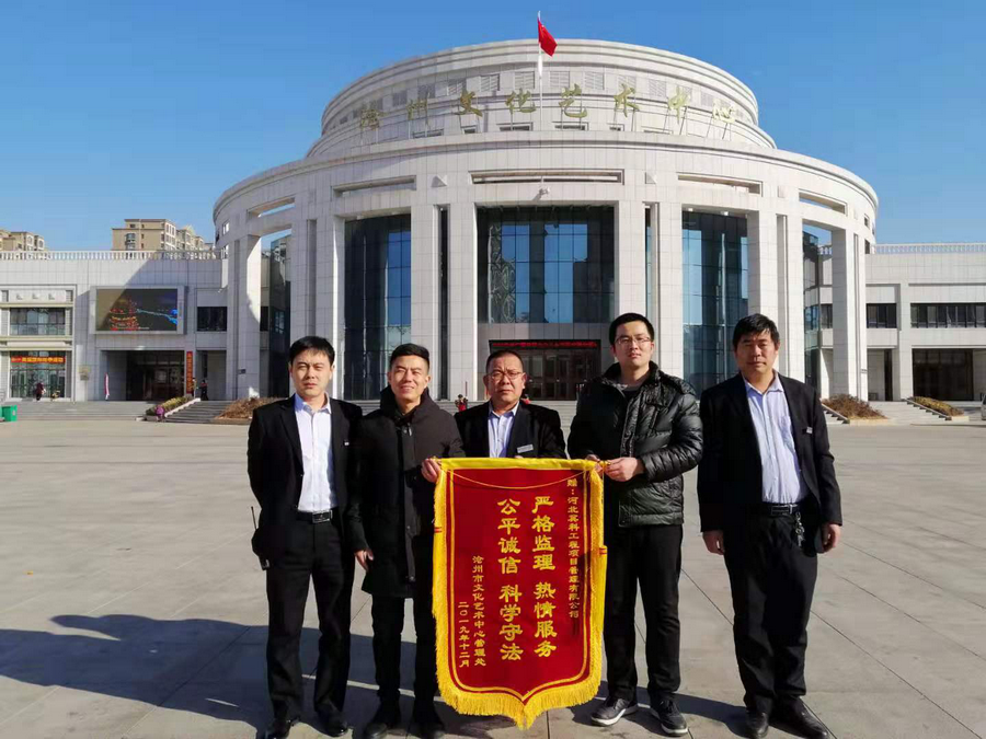 2020年1月14日,滄州市文化藝術中心管理處副主任、項目負責人從震,藝術中心辦公室主任陳華,藝術中心副主任劉偉,藝術中心副主任顏濤向冀科公司贈送了錦旗。項目總監(jiān)陳志成接收了錦旗并表示感謝。