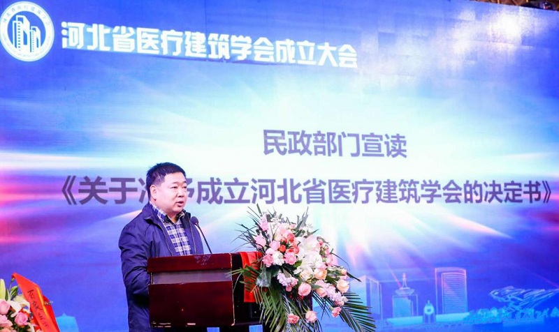河北省民政廳二級調研員劉遠代表民政部門宣讀《關于準予成立河北省醫(yī)療建筑學會的決定書》。