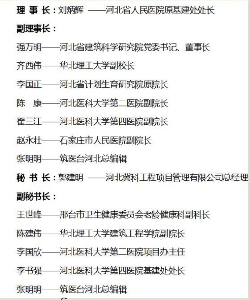 河北省醫(yī)療建筑學會由河北省人民醫(yī)院、河北省計劃生育科學技術研究院、華北理工大學、筑醫(yī)臺科技河北有限公司、河北冀科工程項目管理有限公司五家單位牽頭聯(lián)合發(fā)起,由醫(yī)療衛(wèi)生、建設等領域的高校、科研院所、醫(yī)療機構、企事業(yè)單位、協(xié)會(學會)等單位自愿組成。