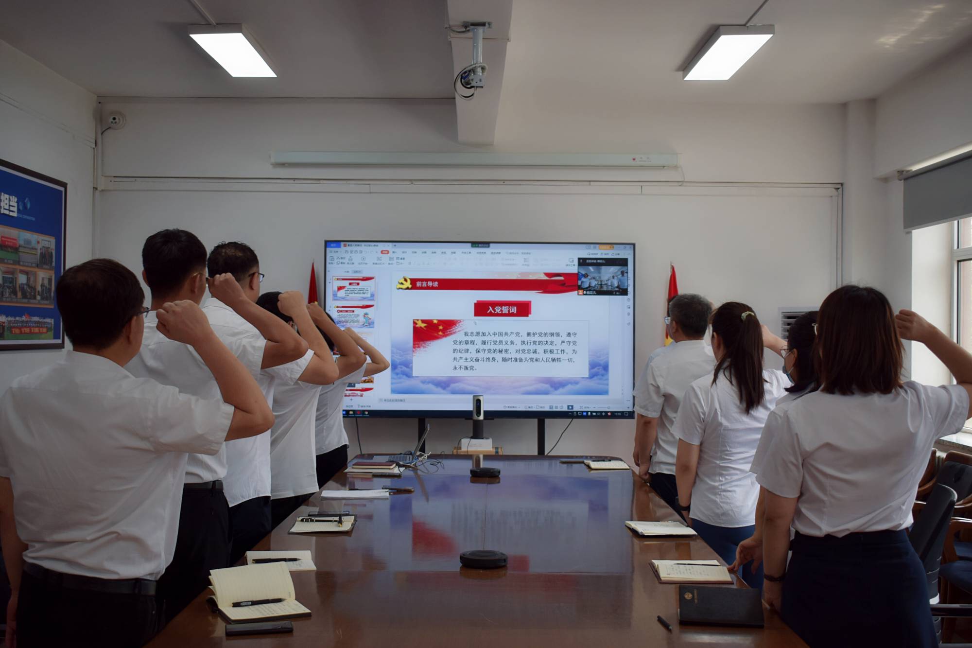 “我志愿加入中國(guó)共產(chǎn)黨,擁護(hù)黨的綱領(lǐng),遵守黨的章程......”在支部書(shū)記的帶領(lǐng)下,全體黨員高舉右拳重溫入黨誓詞。大家神情莊重、聲音鏗鏘,堅(jiān)定有力地表達(dá)了對(duì)黨忠誠(chéng)、為黨事業(yè)奮斗終身的決心。
