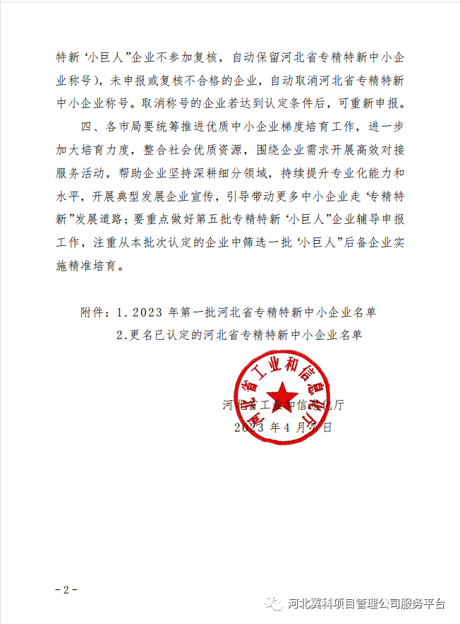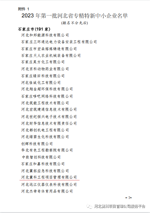 2023年4月7日,河北省工業(yè)和信息化廳發(fā)布《關(guān)于公布2023年第一批河北省專精特新中小企業(yè)名單的通知》,河北冀科工程項目管理有限公司被認(rèn)定為2023年“專精特新”中小企業(yè)。