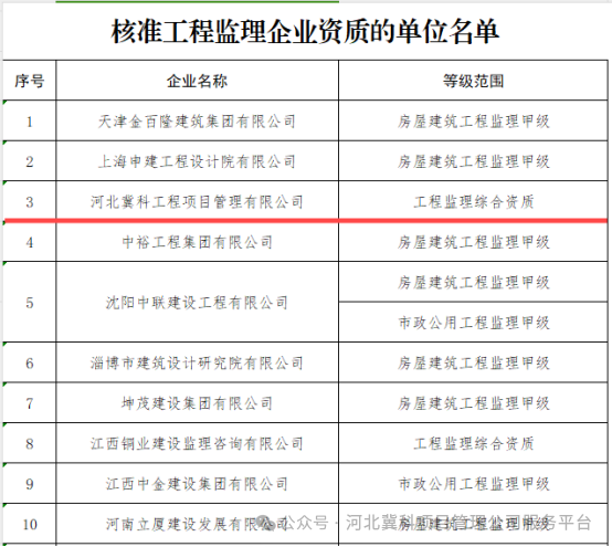 2024年9月24日,住房和城鄉(xiāng)建設(shè)部發(fā)布了《住房城鄉(xiāng)建設(shè)部關(guān)于核準(zhǔn)2024年度第九批建設(shè)工程企業(yè)資質(zhì)名單的公告》,河北冀科工程項目管理有限公司成功晉升工程監(jiān)理綜合資質(zhì)!