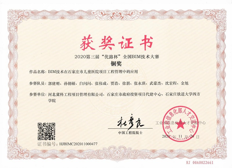 冀科公司榮獲2020年第三屆“優(yōu)路杯”全國(guó)BIM技術(shù)大賽銅獎(jiǎng)