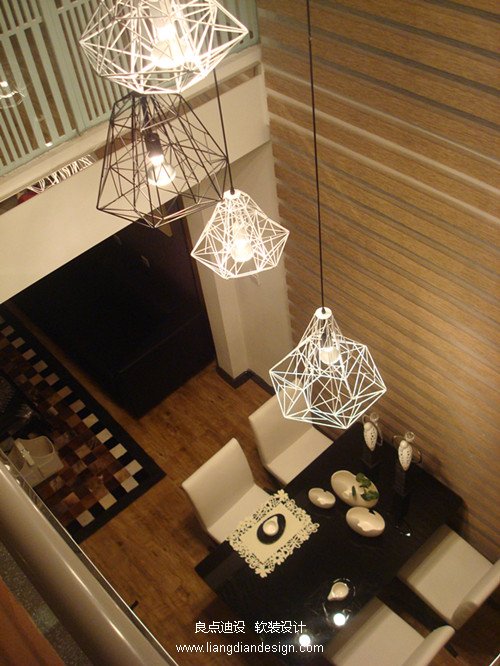 香城壹號LOFT本身是一個挑高空間,樓上樓下雙層生活空間,大的落地窗納入明媚陽光,樓下起居室與餐廳連接一體,舒適自然,給居住者提供方便舒適的使用環(huán)境,在這樣的空間中我們運用大膽時尚的設計風格,餐廳區(qū)域是挑高的空間,窗簾形式也采用簡潔的彩虹卷簾百葉的形式。抽象化的吊燈在空間給人帶來隨意自然的氛圍。現(xiàn)代感皮面沙發(fā)和漸變拼花皮地毯都給人帶來時尚的氣息,二樓樓梯間的照片墻有歡迎客人與展示主人愛好與生活方式的作用,一個小桌配一個復古的皮沙發(fā),不論是暖暖的下午還是深夜都是一個品茶看書的好地方,貴族藍的床品和化妝臺搭配煙灰色紗幔,為臥室營造出典雅浪漫的氣息,LOFT風格創(chuàng)意裝飾就這樣被打造出來。