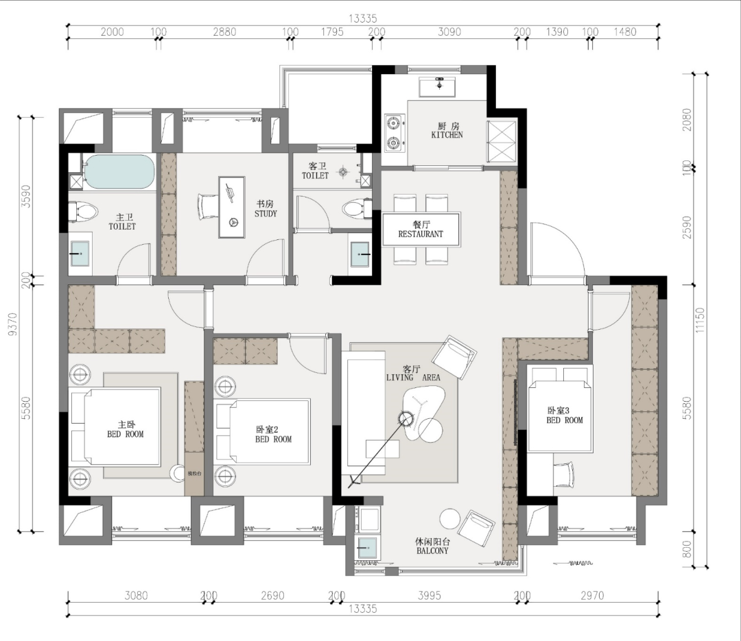 設(shè)計(jì)思路:陽臺打通,打造多功能陽臺。增加門廳換鞋柜和餐廳餐邊柜的儲物功能,保留獨(dú)立書房。臥室3增加儲物空間。