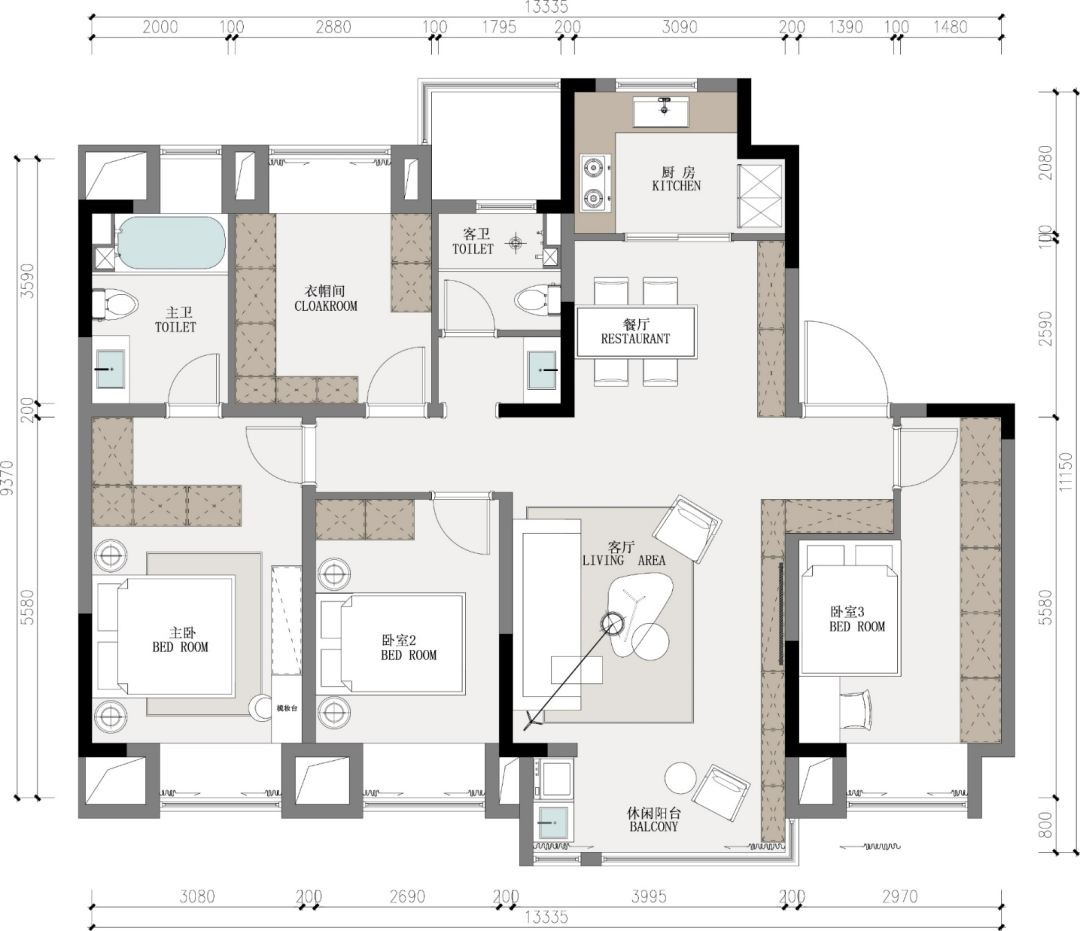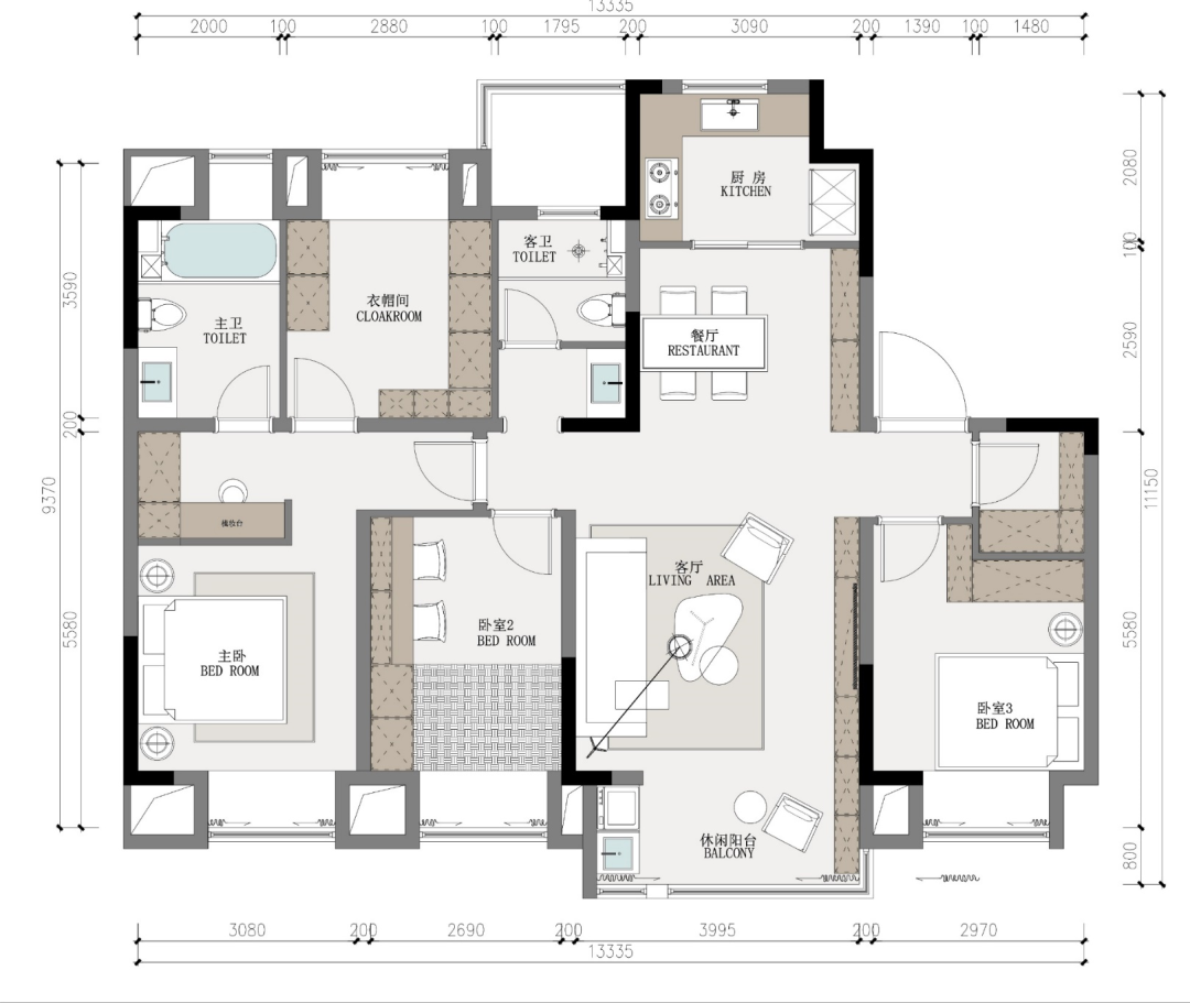 設(shè)計(jì)思路:客廳整體打通,視覺上空間增大,增加活動范圍,更好的培養(yǎng)親子感情,北面一個(gè)房間改成衣帽間,增加儲物空間。