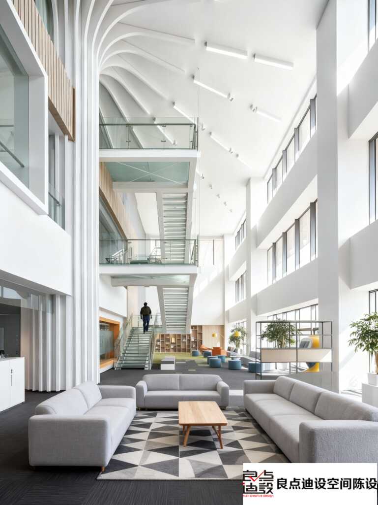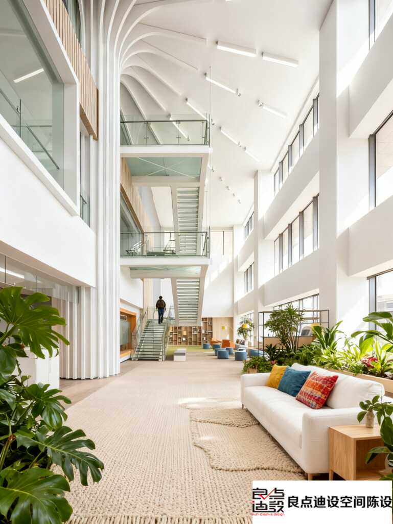 ?? 前臺(tái)區(qū):白色巖板臺(tái)+企業(yè)藍(lán)藝術(shù)墻,綠植墻嵌入燈帶