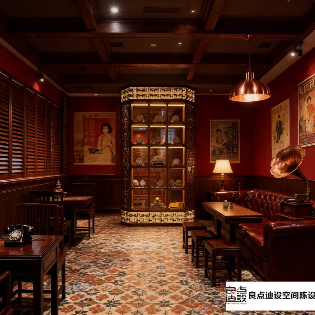往里頭走,那個六角形的展示柜直接把我吸引住了。陳列著各種精美瓷器,擺得那叫一個講究!軟裝不是亂堆東西,而是有節(jié)奏的陳列藝術(shù)。瓷器在燈光下泛著溫潤的光,和整個空間的紅色調(diào)呼應(yīng),細(xì)節(jié)控看了都得服氣。說到地面,花磚鋪得那叫一個精彩!色彩斑斕卻不雜亂,反而和紅墻、深色家具形成了絕妙層次,每一步都像踩在復(fù)古畫報上。