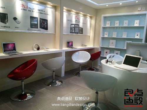 本Apple專營店背景色是地面的灰色和墻面的白色,配以原木色和亮銀色家具,點綴上高貴的具有科技感的炫色個性座椅,整個空間色彩搭配明快高調(diào),凸顯Apple高級、尊貴與時尚。