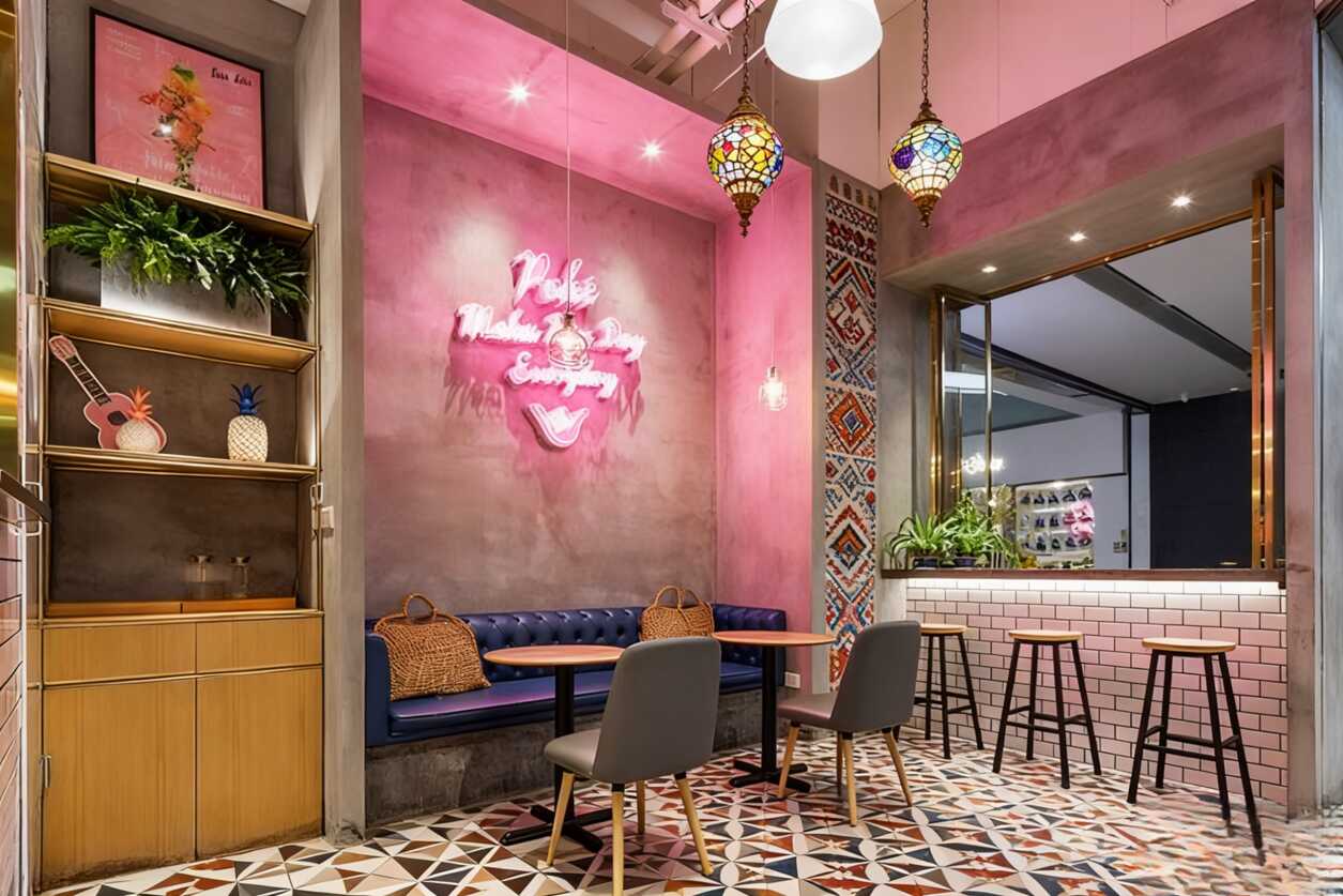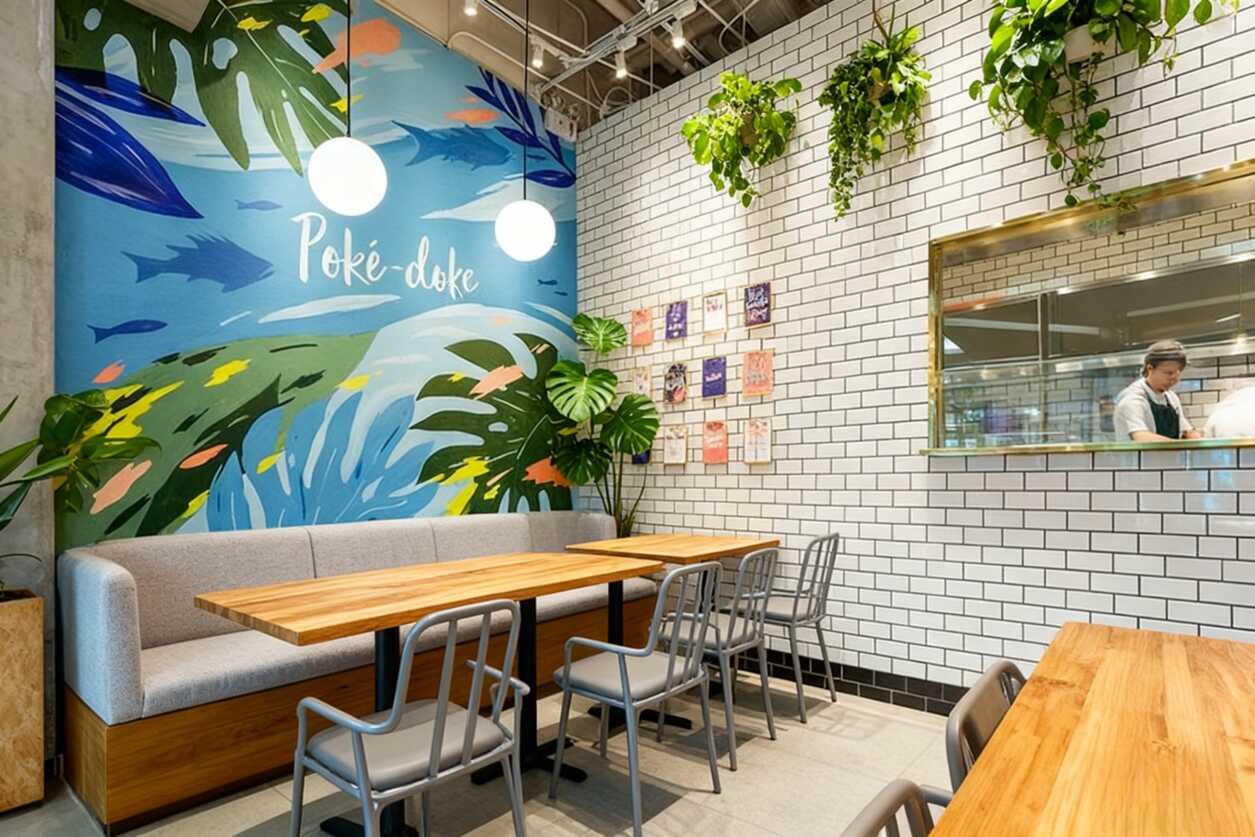 家人們,你們有沒有遇到過那種一走進(jìn)去就忍不住掏手機(jī)的餐廳?今天咱就來扒一扒這家憑軟裝直接封神的網(wǎng)紅店!說真的,光是那面墻就夠你拍九宮格了——紅橙黃綠藍(lán)的彩旗串成一排,上面印著“SALMON”“ALOHA”這種自帶度假感的英文詞,再配上熱帶植物圖案,瞬間把你拉進(jìn)夏威夷海灘模式。背景是干凈到反光的白色瓷磚墻,深藍(lán)色皮質(zhì)卡座往那兒一擺,高級感直接拉滿,懂的都懂這是出片神器啊!