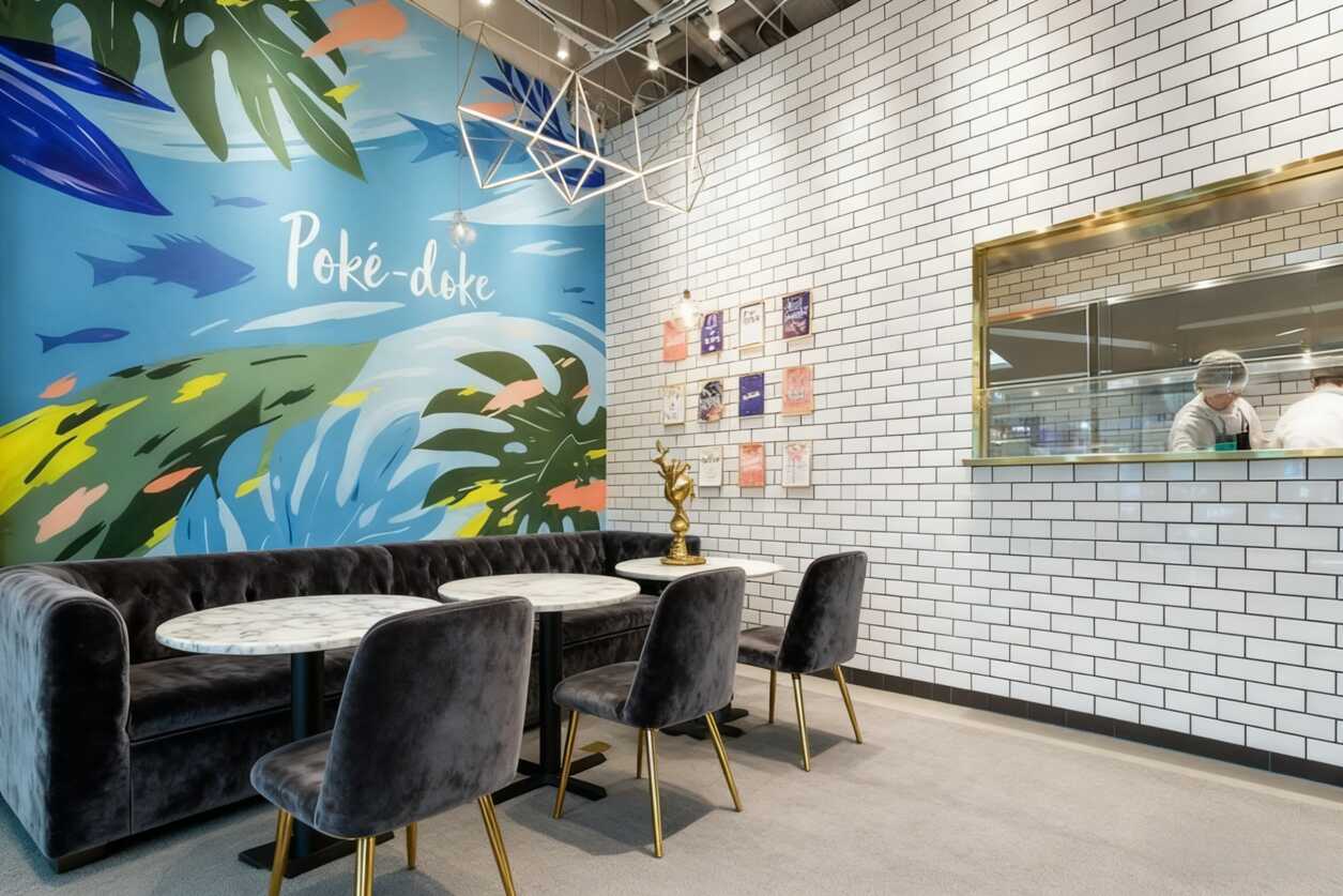 寶子們!今天要安利這家讓我一進(jìn)門就瘋狂拍照的Poke餐廳!白色瓷磚墻搭配黑色工業(yè)風(fēng)管道,簡(jiǎn)約中透著高級(jí)感,***吸睛的是整面海洋主題壁畫——游動(dòng)的魚群和棕櫚葉圖案,瞬間把海邊度假氛圍拉滿!