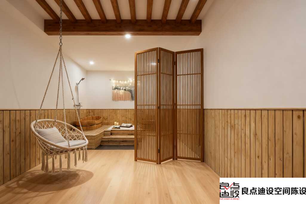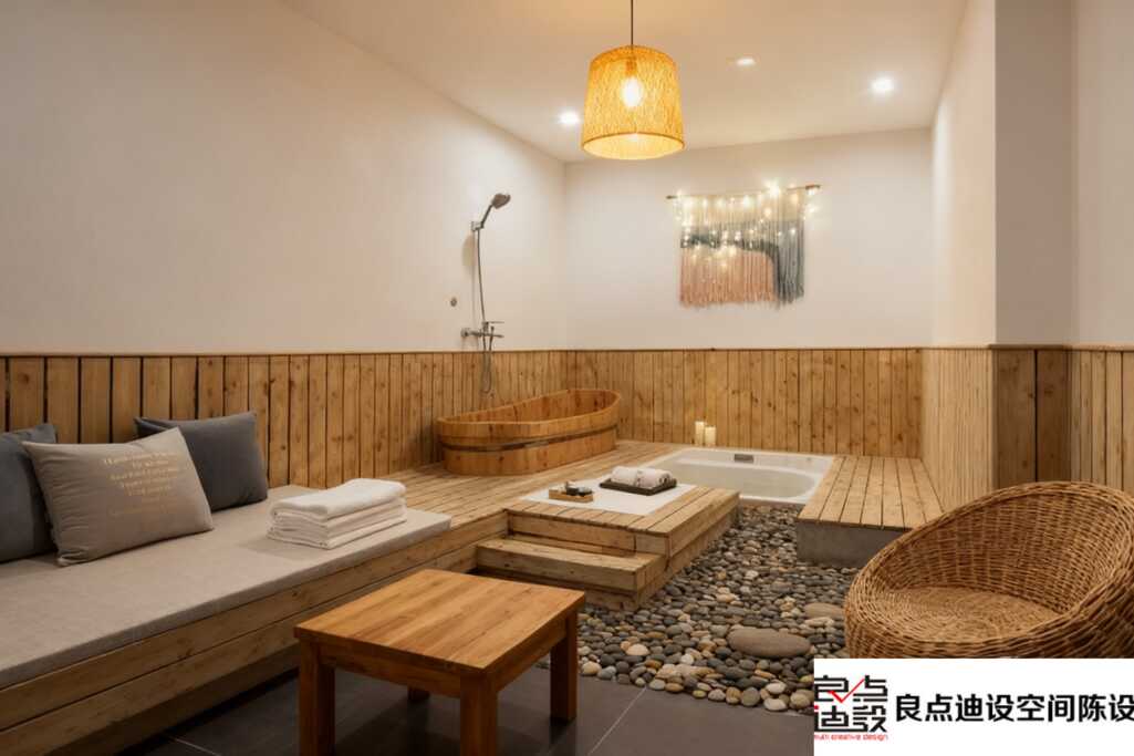 角落里還有個木質浴缸,原木質感呼應了墻面,旁邊配張小茶幾,擺兩根香薰蠟燭。這布置小心機啊,簡直在悄悄喊你:“快來泡個澡放松呀!” 說真的,軟裝設計做到這份上,已經(jīng)不光是裝飾了,更像在講故事——每個角落都在邀請你慢下來,享受一段專屬的愜意時光。