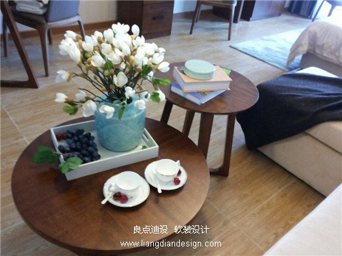空間軟裝色彩:柚木色 象牙色、灰藍(lán)色