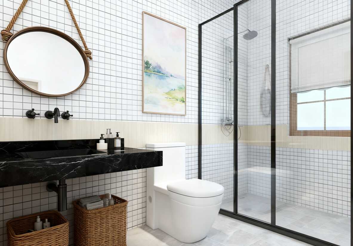 被問爆的民宿浴室軟裝設計!黑白格 + 藤編筐 + 藝術畫,洗澡都像在逛藝術展