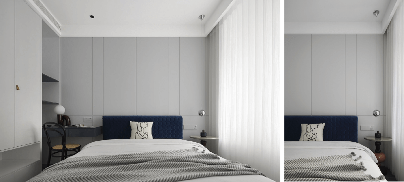 在房頂凹槽處做燈帶設(shè)計(jì)代替原有的主燈,實(shí)現(xiàn)極簡(jiǎn)大方的燈具設(shè)計(jì),讓整個(gè)房間簡(jiǎn)潔明亮,視覺上房間更加寬敞,L型透明衣柜,在臥室中形成了小型衣帽間,同時(shí)能作為隔斷,分隔洗浴區(qū)和睡眠區(qū),茶色的透明玻璃柜門提升空間的通透感,實(shí)用又高級(jí),拿取衣服更加方便,更有一種精致的高級(jí)感,讓衣柜中的衣服成為一種展示品,美觀與實(shí)用兼具。
