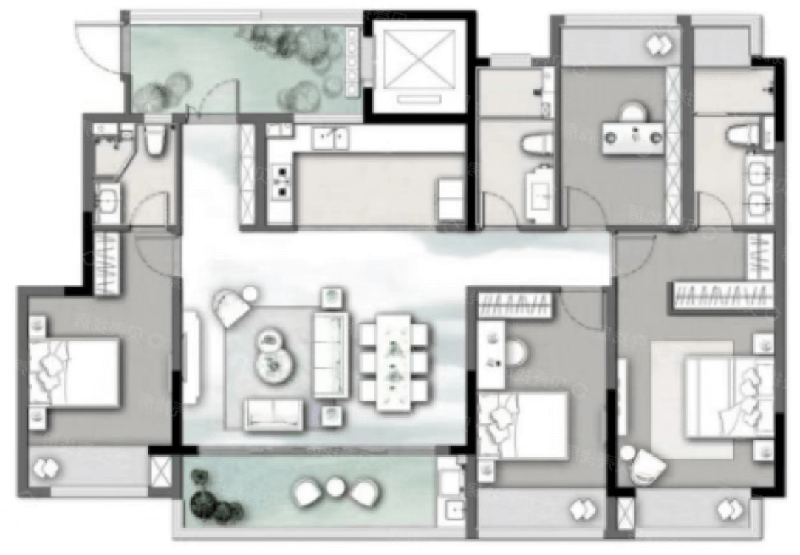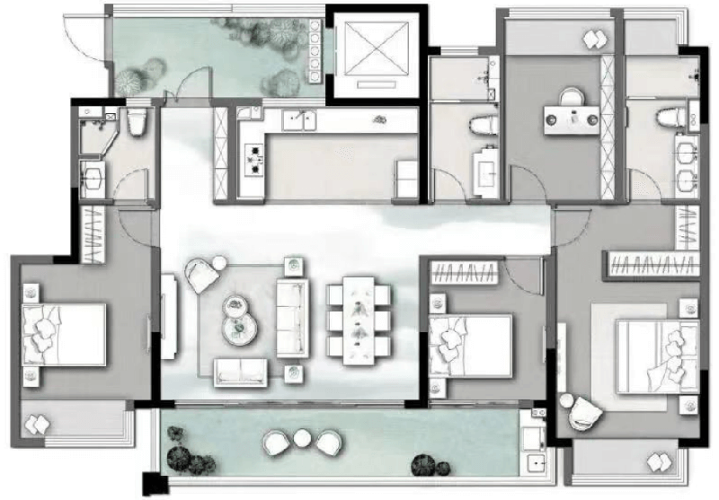 四間臥室,三間朝南,采光充足,父母房中帶有獨(dú)立衛(wèi)浴,方便老人起夜,衛(wèi)生間更是要做適老化設(shè)計(jì),方便老人居住和使用,沿墻面定制的L型收納柜,***利用拐角空間,收納功能強(qiáng)大。兒童房帶有飄窗,視覺效果寬敞,改良采光,讓房間更加明亮,稍微裝飾下,鋪幾個(gè)蒲團(tuán),坐在午后的陽(yáng)光里,看書喝茶擼貓。主臥中L型衣柜設(shè)計(jì),形成獨(dú)立的小型衣帽間,浴室中兩個(gè)盥洗盆設(shè)計(jì),方便男女主人早上上班時(shí),不會(huì)出現(xiàn)匆忙爭(zhēng)搶的現(xiàn)象。朝北臥室設(shè)計(jì)成衣帽間和書房,解決家中收納問題,同時(shí)也提供了獨(dú)立安靜的學(xué)習(xí)工作空間。