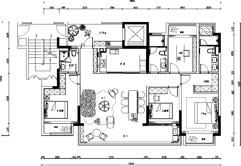 和E2戶型中的***稿設(shè)計(jì)方案相比,第二稿設(shè)計(jì)方案中,打通了客廳陽(yáng)臺(tái)空間,使得整個(gè)客餐廳空間更加寬敞明亮,客餐廳空間更加相容,餐桌延長(zhǎng)臺(tái)面裝有水池,方便用餐時(shí)洗手洗水果等,沙發(fā)椅等不規(guī)則的設(shè)計(jì),使得整個(gè)客餐廳空間更具有設(shè)計(jì)感、時(shí)尚感。