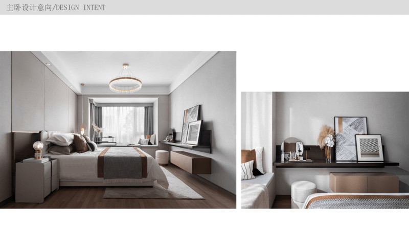 主臥 交付時(shí)帶有飄窗,可以將飄窗位置利用起來(lái),改造成一個(gè)mini的學(xué)習(xí)區(qū),背景墻按照風(fēng)格和喜好做硬包,在床尾設(shè)立斗柜和化妝臺(tái),滿(mǎn)足女主人的日常需求,因?yàn)橹髋P帶衣帽間,所以收納已經(jīng)足夠了,主要以裝飾和體驗(yàn)感為主。