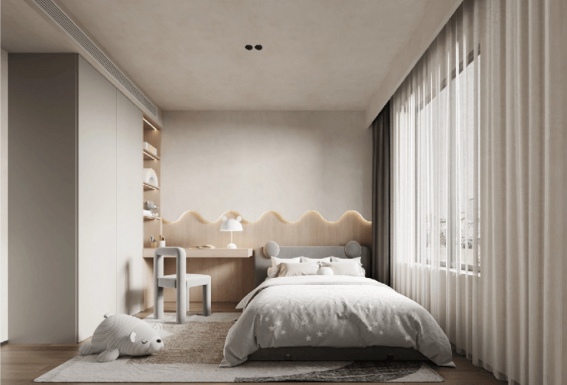 次臥相比主臥要小很多,利用床頭墻面,打造收納+書柜一體化定制床頭柜。打造沉穩(wěn)、淡雅、溫暖的感覺, 忌過冷、艷、暗、亮。