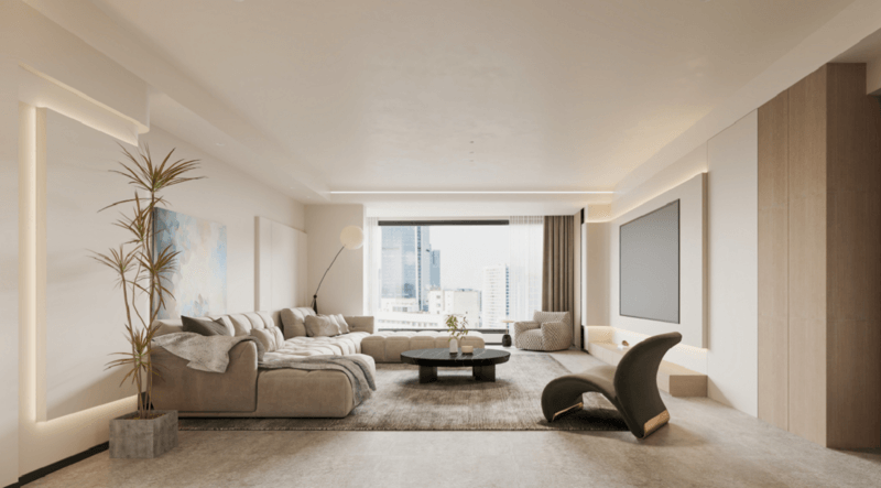 在第二個方案中,設(shè)計師將客餐廳與北陽臺打通,擴大可利用的空間,廚房也作開放式,增加了一些功能區(qū)。打破傳統(tǒng)的沙發(fā)形式,選擇組合式沙發(fā)結(jié)合學(xué)習(xí)區(qū),利用懸掛式投影將客餐廳進行區(qū)分,廚房全開放式延伸出島臺式餐桌,既增加了可操作臺面,也提高了廚房的儲物收納性。