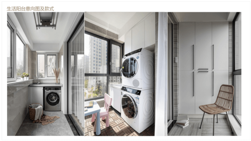在生活陽臺上設(shè)計(jì)洗衣池,可以選一體式臺盆,帶三面擋水。遵循上烘下洗的原則,衣服拿出來就可以穿,減少晾曬時間。轉(zhuǎn)角的空間剛好收納家政工具,適當(dāng)利用洞洞板進(jìn)行收納,更加整潔。
